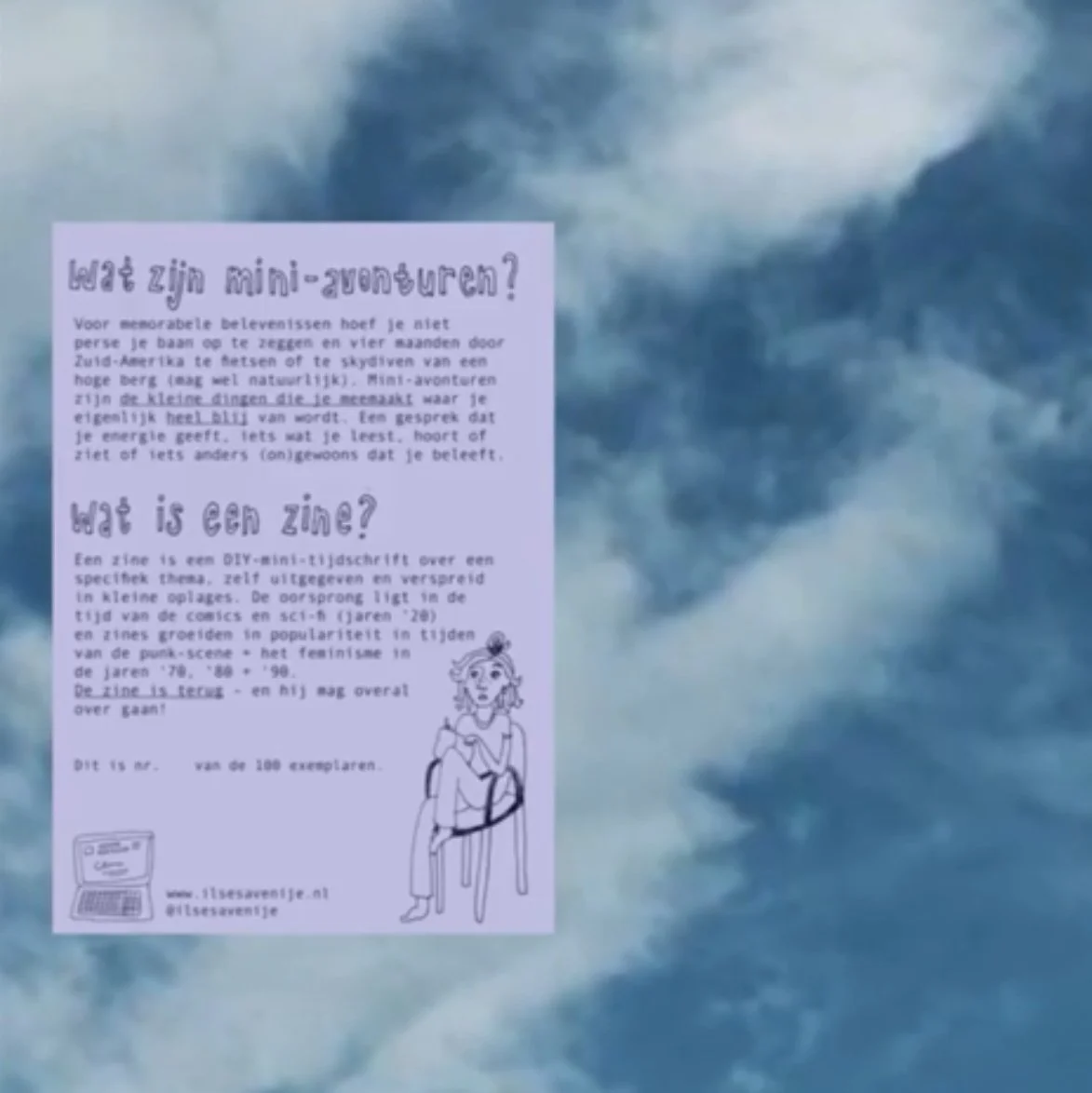 Mijn allereerste zine ging over mini-avonturen: de kleine dingen die je meemaakt en waar je blij van wordt. Een gesprek dat je energie geeft, iets wat je leest, hoort of ziet, of iets anders (on)gewoons dat je beleeft.